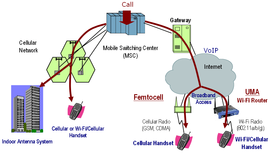 - O gateway FemtoCell, contando com um gateway de segurança que finaliza grandes números de conexões de dados IP criptografados de centenas de milhares de FemtoCells, e um gateway de sinalização, que agrega e valida o tráfico de sinalização, autentica cada FemtoCell e promove a interface com o núcleo da rede móvel;