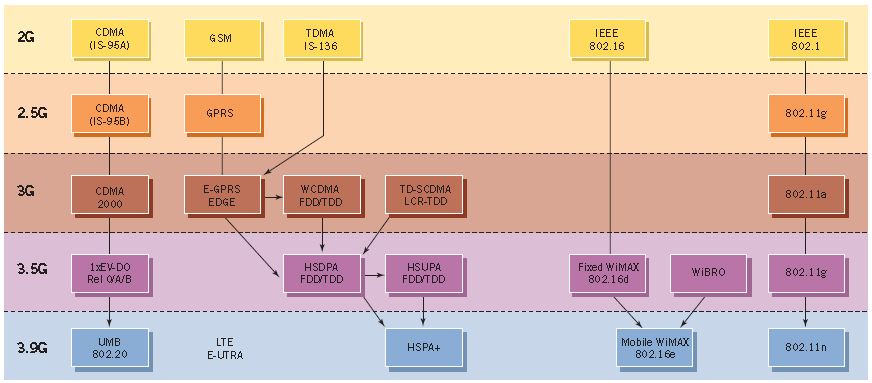 Para a definição do padrão 4G, o ITU acorda que será duas tecnologias: o LTE-advanced e o Wimax 2 (WirelessMAN-Advanced2, baseado no padrão WiMAX 802.16m). As duas tecnologias promovem o avanço da taxa de dados e a mudança completa da comutação de circuitos para a comutação de pacotes, convergindo tudo para uma única rede, a rede IP.