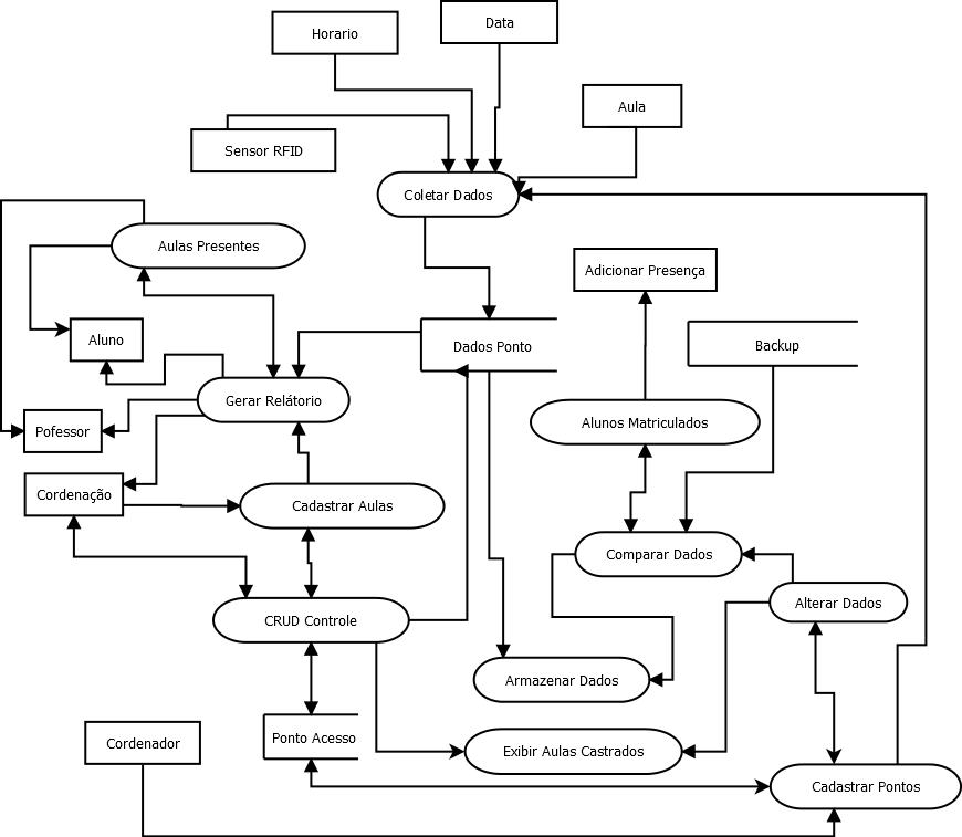 Controle: Consiste em uma interface WEB que acessa o banco de dados, ele possui um painel de login tanto para aluno, como para professores e coordenação. Através dessa interface é possível gerar relatórios com o numero de faltas e presença, com acesso de nível superior (Professores e Coordenação) é possível cadastrar aulas, novos pontos de acesso, modificar os horários e configurações de todos os pontos conectados a rede.