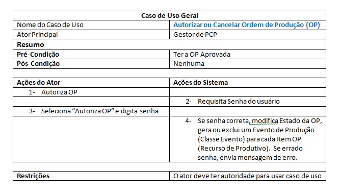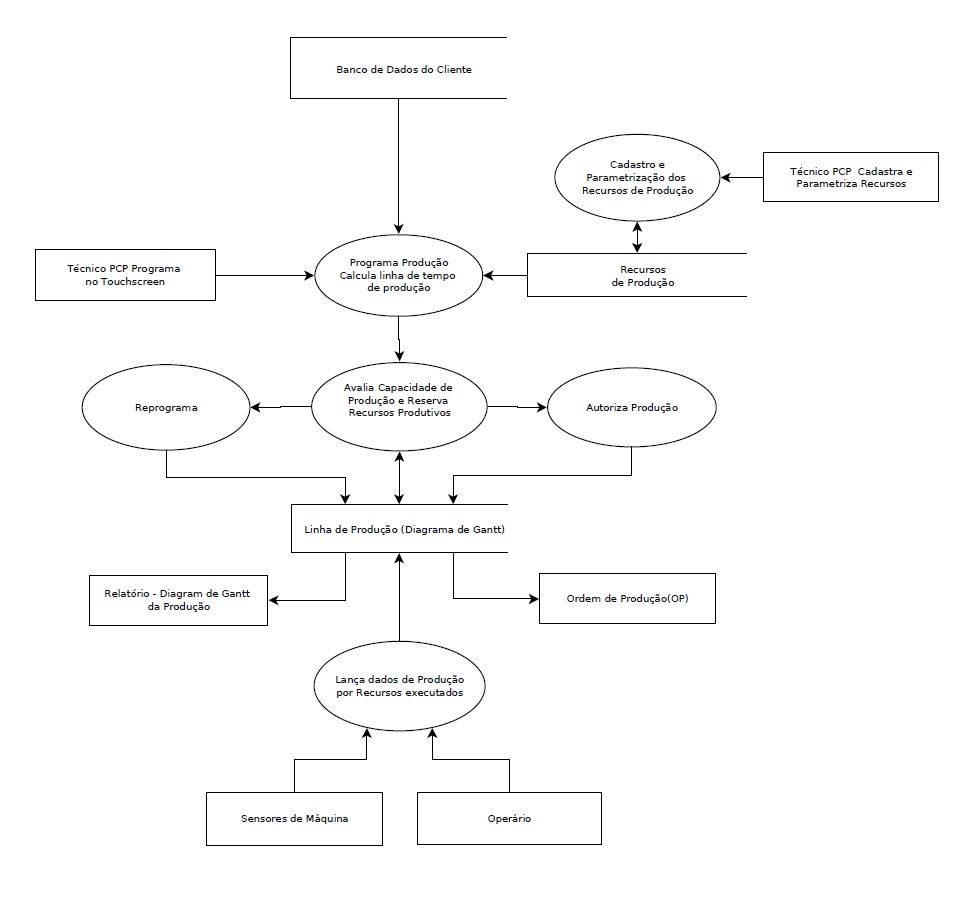 - Programar Produção: Armazena os dados da Ordem de Produção (OP) no Banco de Dados do Sistema. Valida os recursos da OP com as especificações das máquinas ou da mão de obra empregada na OP. Se tiver em conformidade as informações da OP juntamente com a capacidade de produção, passa-se para o cálculo do tempo de execução da OP.O Técnico de PCP pode também programar outros tipos de recursos (operações ou processos) nos períodos ocioso da máquina tipo manutenção preventiva), paradas de máquinas (defeito mecânico, falta de energia, limpeza e etc)