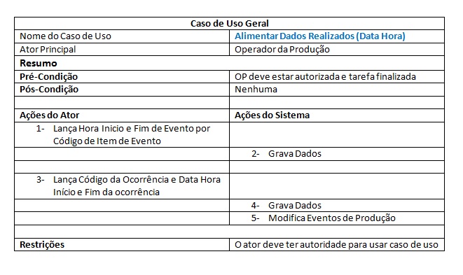 - Lançamentos de dados nos sistemas através de: hardwares instalados nas máquinas (sensores, contadores, digitalizador, etc); leitores de códigos de barras e terminais "burros" (sem capacidade de processamento) na linha de fabricação. Estes dados fornecidos vão integrar os dados de volume de produção, de conclusão de etapas de execução de tarefas, tempos setups (tempos de parada na produção, seja por ajuste, manutenção, etc) códigos e nome de operadores e etc.