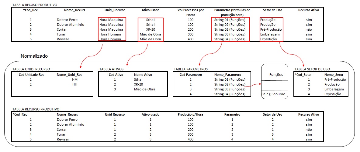 Ao fazer a análise na Tabela Recurso Produtivo verificamos aninhamento de dados e uma composição com uma Classe já normalizada (Ativos MQ e MO). Como a Classe de Ativos não depende do Recursos Produtivo para existir, mas o recurso precisa de um ativo (dependência parcial), então tivemos que criar mais um Classe de transição agregada a Classe Recursos Produtivos que contem Ativos, e que chamamos de “Item Recurso” que passa ter um dependência direta com o a Classe Recurso Produtivo. Para desaninhar as tabelas e ficar adequada ao 2FN, criamos também as Classes Unidade Recurso e Setor Uso e Parâmetro.
