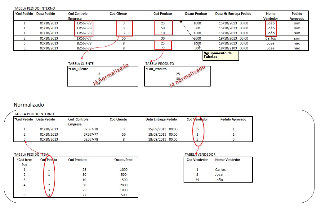 Na Tabela Pedido Interno temos aninhamento de dados e valores não atômicos, ou seja, um pedido relaciona com vários Produtos possuindo repetição de dados. Foi necessário decompor em mais duas tabelas gerando a Tabela de Vendedor e Pedido Item (onde alocamos os produtos). Percebemos que a Classe Pedido Item não poderia está agregado ao Pedido pois cada produto deriva (ramifica) vários processos para sua execução portanto tornaria independente e associada ao produto e ao pedido.