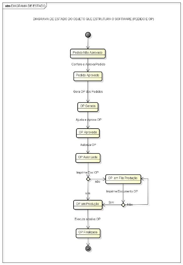 O Diagrama de Estado mostra o estado dos principais objetos (Pedido e OP) em suas fases de execução e tratamento. A venda gera um pedido que é importado para dentro do sistema CPP como um "Pedido Interno". Enquanto o Pedido Interno não for revisado e aprovado, ou seja, conferido e validado sua execução, o "estado" é de apenas de "Pedido Não Aprovado". No momento em que se dá a sua aceitação através de comando e login de senha, o estado do Pedido passa a ser "Aprovado" e gera-se automaticamente uma Ordem de Produção (OP) cujo seu estado é de apenas "OP Gerada". A Ordem de Produção requisita que seja agregado os Recursos Produtivos que se tornam "itens da OP" necessário para manufatura do produto. Após realizar todos os ajustes necessário (como como por exemplo um remanejamento de máquinas) o usuário pode aprovar através de login de senha a OP, então a mesma passa para o Estado de "OP Aprovada", que requisita ao seu superior que autorize a mesma para a produção. O coordenador do setor ao autorizar produção através de login de senha altera automaticamente o estado da OP para "OP Autorizada", e gera-se automaticamente um Evento para cada Item OP. A não impressão do documento que vai para produção implica que a OP está autorizada mas em aguardo, e seu estado é representado na fila do diagrama de Gant por um vetor do item na cor cinza esmaecido. Após impressão do documento o estado passa para "OP em produção" e o vetor adquire uma cor viva diferente de cinza. Ao finalizar a execução de todos os itens da OP Coordenador do PCP lança a data efetiva na interface de usuário da própria OP através de login de senha passando o estado da OP para "OP Finalizada" e bloqueia-se todas as operações e atributos nas classes que referencia a OP.