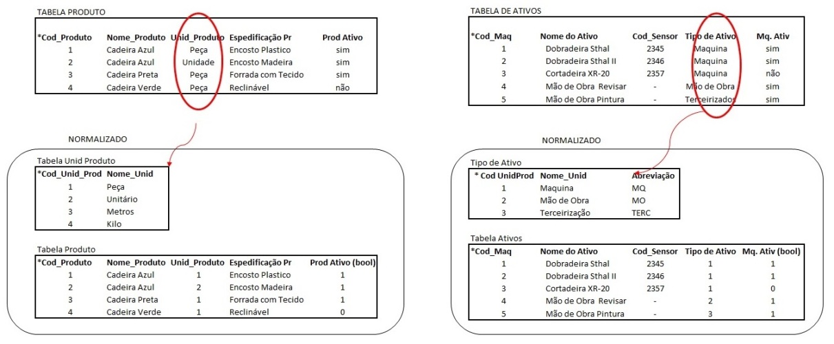 Na Tabela Produto e na Tabela de Ativos, os atributos cujos dados não se repetem e consequentemente candidatos a chave primária são os seus próprios código de identificação. Os demais atributos tinha uma dependência funcional em relação ao código de identificação da Classe. Havia também aninhamento de informações e consequentemente de tabelas, que tivemos que desmembrar.