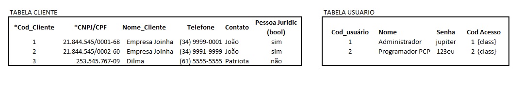 A “Tabela Cliente” tinha os atributos “Código Cliente” e o “CNPJ/CPF” como candidatos a chaves primária , pois os demais atributos eventualmente estavam suscetíveis a se repetir ou possuíam dependência funcional sobre o código Cliente. A única precaução que tivemos foi lançar duas chaves primárias na tabela Cliente já que o CNPJ ou CPF jamais poderia se repetir e individualiza o Nome_Cliente em situações de repetição como no exemplo abaixo . Quanto a “Tabela Usuário” não houve necessidade de normalizar apenas a estabelecer chave primária o código do usuário
