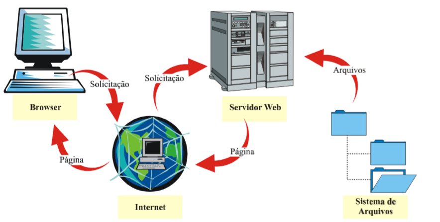A web funciona utilizando o paradigma cliente-servidor. Neste modelo de computação, o processamento é dividido, conforme o nome sugere, entre clientes e servidores. Os clientes solicitam serviços os quais são executados pelos servidores. Os clientes são os navegadores (Chrome, Internet Explorer, Safari, Firefox, etc) que proporcionam a interface com o usuário. Estes navegadores transformam os pedidos dos usuários de forma que os servidores possam entender. Os servidores processam os pedidos e devolvem os dados aos usuários [2].