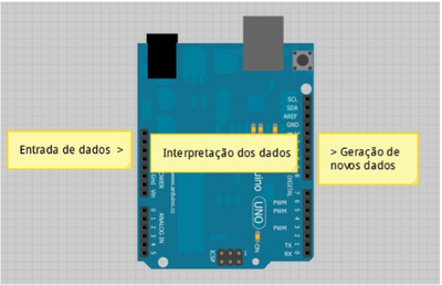 Intepretação de dados, a placa interpreta o código e faz com que cada porta, tenha sua devida função já programada no IDE.