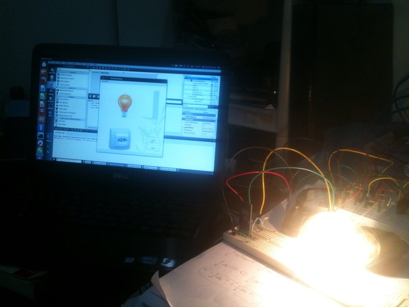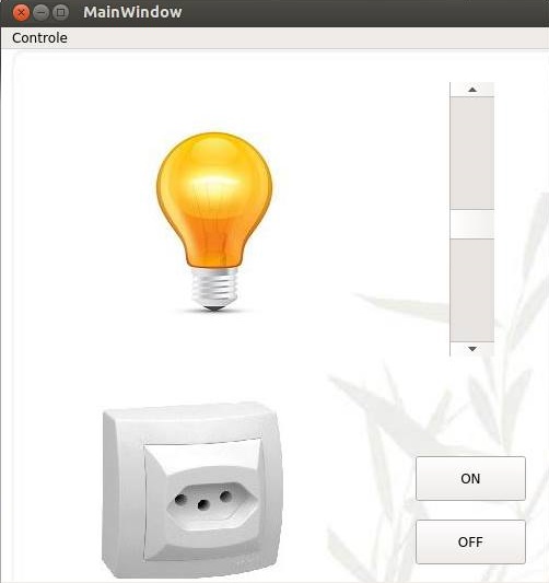 - O arduino controla uma lâmpada, à partir de um dimmer e um módulo bluetooth,que é responsável com a comunicação com a interface no computador.A interface feita utilizando o programa QT possibilita controlar por meio de um scroll bar a porcentagem de potência entregue a lâmpada ,desligar ou ligar ela por meio de botões,controle esse que seria feito pelo relé no sistema completo, para haver total abertura do circuito.Para simplificação da comunicação serial da interface com o programa do arduino o dimmer faz essa função no protótipo, quando o botão on é ligado ele funciona como uma chave aberta e quando o botão off é pressionado como uma chave fechada.