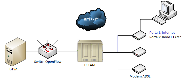 O servidor atuará como um DTSA, isso quer dizer que neste serão instaladas as funcionalidades do mesmo. O caminho entre o host e o servidor, especificamente o DSLAM e o modem devem atuar como um circuito transparente, sem nenhuma ação sobre os pacotes que trafegarão na rede. Desta forma cada usuário associado a um modem pode tentar acessar este servidor para registrar-se, e o mais importante nesta primeira etapa é garantir que este novo pacote desta rede não seja descartado pelo modem. Observado este comportamento novos testes poderão ser efetuados.
