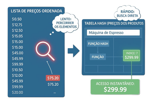 Com a tabela hash, a chave é convertida diretamente em um índice, permitindo acessar o valor de forma direta, sem percorrer toda a estrutura. Isso torna a busca muito mais eficiente.