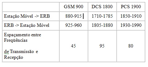O GSM foi padronizado para operar nas faixas de freqüências apresentadas na tabela, sendo o GSM 900 e o DCS 1800 adotados na Europa e o PCS 1900 nos Estados Unidos. No Brasil as Bandas C, D e E estão na faixa de freqüências do DCS 1800, tendo sido licitados inicialmente 15 MHz por operadora em cada direção. (Consulte a seção Freqüências no Brasil)