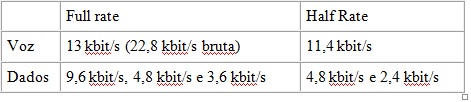 No GSM é possível encontrar 3 tipos de codificadores de voz (vocoder): o Enhanced Full Rate (EFR) e o Full Rate com taxa de 13 kbit/s, e o Half Rate com taxa de 9,6 kbit/s.