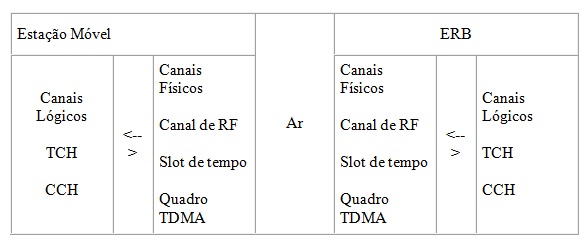 - No GSM nenhum canal de RF ou time slot está designado a priori para uma tarefa particular. A informação do usuário (voz e dados) e os dados de controle de sinalização são transmitidos em dois tipos básicos de canais lógicos que vão ocupar a estrutura do quadro (frame) TDMA: canal de tráfego (TCH) e canal de controle (CCH).Estes canais lógicos são mapeados nos canais físicos conforme a figura a seguir: