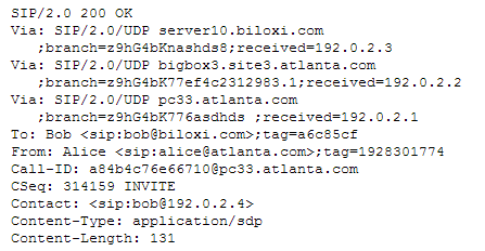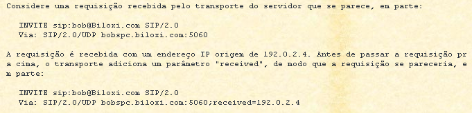 - Via: contém o endereço pelo qual Alice espera respostas para esta requisição, que também contém um parâmetro que identifica a transação.