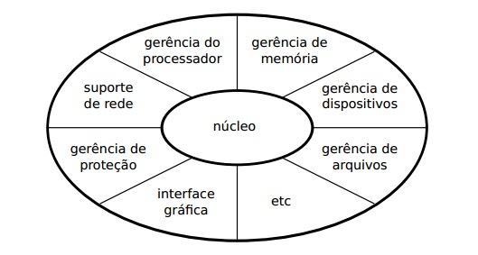 - Núcleo: responsável pela gerencia dos recursos do hardware usados pelas aplicações; é ele também que implementa as principais abstrações a serem utilizadas pelos programas.