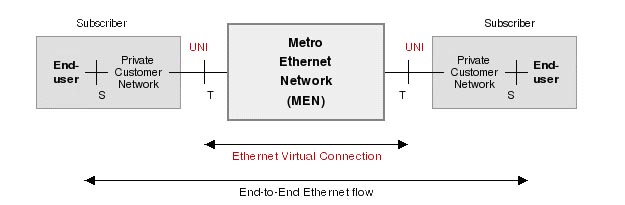 - Um conceito importante para essa arquitetura é o conceito de Conexão Ethernet Virtual (EVC), definido pelo Metro Ethernet Fórum (MEF) como sendo a associação de duas ou mais UNIs, com dois objetivos principais: transportar um fluxo de dados entre duas ou mais UNIs e, prevenir a transferência de dados entre sites que não fazem parte da mesma EVC, oferecendo privacidade e segurança. Existem duas regras básicas ao transportar pacotes através de uma EVC: Primeiro, um frame nunca será entregue para a UNI que o criou e, os frames devem ser entregues com o endereço MAC e o conteúdo inalterado.