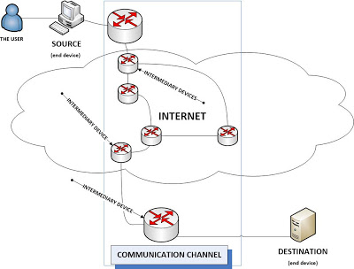 - Basicamente, a Internet é formada por roteadores e switches responsáveis por tornar possível a comunicação entre a fonte (uma página web, por exemplo) com o destino (um servidor http, também como exemplo), como é possível visualizar na Figura 4.1. [4C] A seguir serão descritos alguns conceitos dos equipamentos necessários para tal comunicação:
