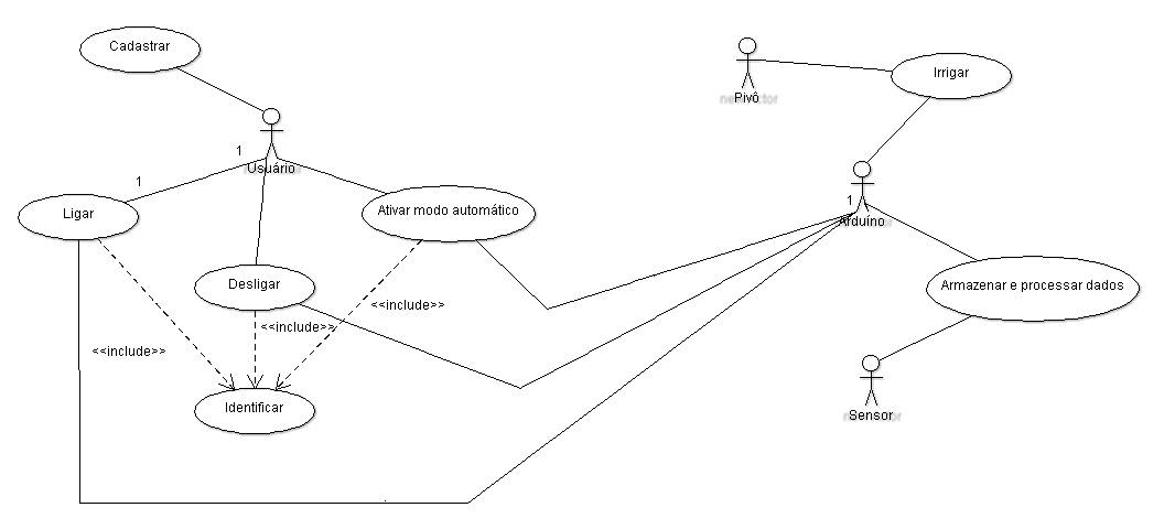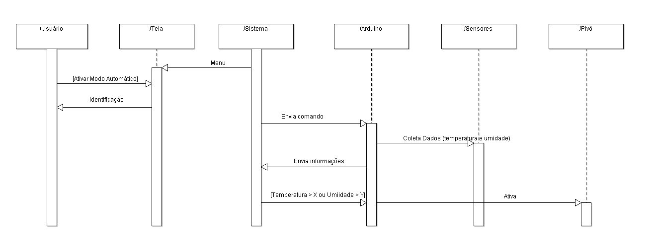 Este protótipo possui as funções Ligar o Pivô, Desligar o Pivô e Ativar o Modo Automático. A interface de comunicação entre o usuário e o sistema é um display, dois botões e dois LEDs. Inicialmente, o pivô está desligado. Quando o usuário aperta o botão Ligar, o Arduino processa esta ação e libera tensão para o relé, que ativa a bomba de água, fazendo o pivô aspergir enquanto o botão Desligar não for apertado. Quando isto ocorre, o Arduino para de liberar tensão para o relé, desligando, assim, o pivô. Voltando à situação inicial (pivô desligado), se o botão Modo Automático for apertado, o Arduino processa esta ação e coleta dados do sensor. Se a temperatura ambiente (ou do solo) for menor que 23°C(*), o pivô continua desligado, porém, se a temperatura for igual ou maior que este valor, o pivô é ligado da mesma forma descrita anteriormente. Depois de ligado, o pivô continua aspergindo continuamente, sendo desligado somente quando a temperatura atinge um valor menor que 23°C(*) ou apertando-se novamente o botão Modo Automático.