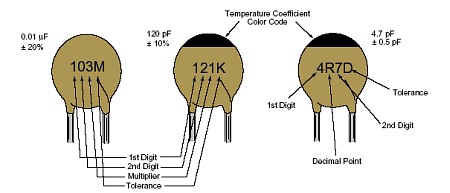 - Existem dois sistemas de leitura para os valores nominais dos capacitores de cerâmica, ambos os sistemas se aproximam muito dos sistemas utilizados pelos resistores. Um deles se trata de três numeros e uma letra, os dois primeiros numeros são os algarismos, o terceiro numero é a potência de 10 multiplicadora, e a letra é a tolerância. Como a seguir: